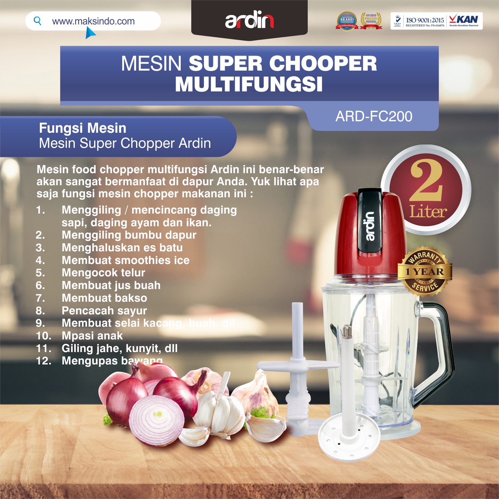 Mesin Food Chopper Ardin Multi Fungsi ARD-FC200 merupakan Mesin yang digunakan untuk membuat aneka makanan dan minuman. Telah tersedia di Toko Mesin Maksindo
