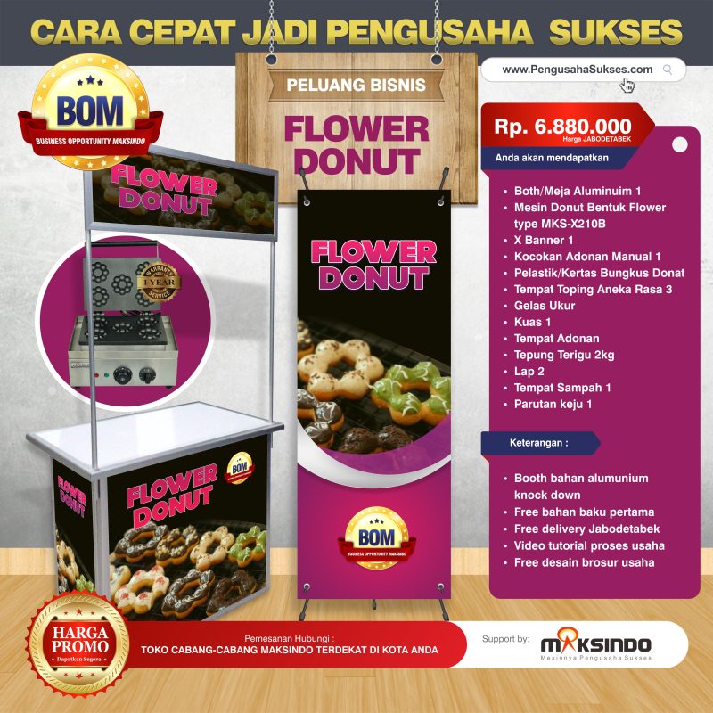 Mari bergabung dan ambil peluang bisnis opportunity Maksindo paket usaha Flower Donuts Dengan biaya Rp. 7.310.000 Anda akan langsung siap buka usaha Flower Donuts. Dengan kelengkapan both, mesin, video tutorial, bahan baku pertama, dll. Adapun penawaran menarik ini bisa Anda lihat selengkapnya di bawah ini :