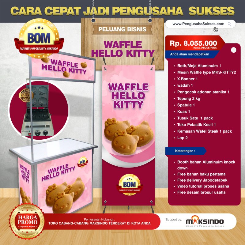 Mari bergabung dan ambil peluang bisnis opportunity Maksindo paket usaha Waffle Hello Kitty dengan biaya Rp 8.570.000 Anda akan langsung siap buka usaha Waffle Hello Kitty. Dengan kelengkapan both, mesin, video tutorial, bahan baku pertama, dll. Adapun penawaran menarik ini bisa Anda lihat selengkapnya di bawah ini :