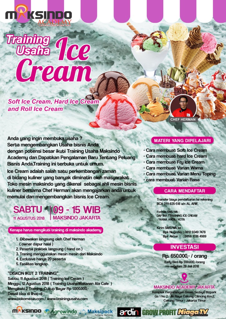 Anda yang ingin membuka usaha ?Serta mengembangkan Usaha bisnis Anda dengan potensi besar dengan skala Franchise ikuti Training Usaha Maksindo Academy dan Dapatkan Pengalaman Baru Tentang Peluang Bisnis Anda, Training ini terbuka untuk umum Ice Cream adalah salah satu perkembangan zaman di bidang kuliner yang banyak
